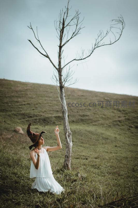 一位头戴巫师帽的少女跪坐在青翠山坡上,手指指向天空,身旁是一棵光秃的孤树,画面充满童话般的神秘与宁静。