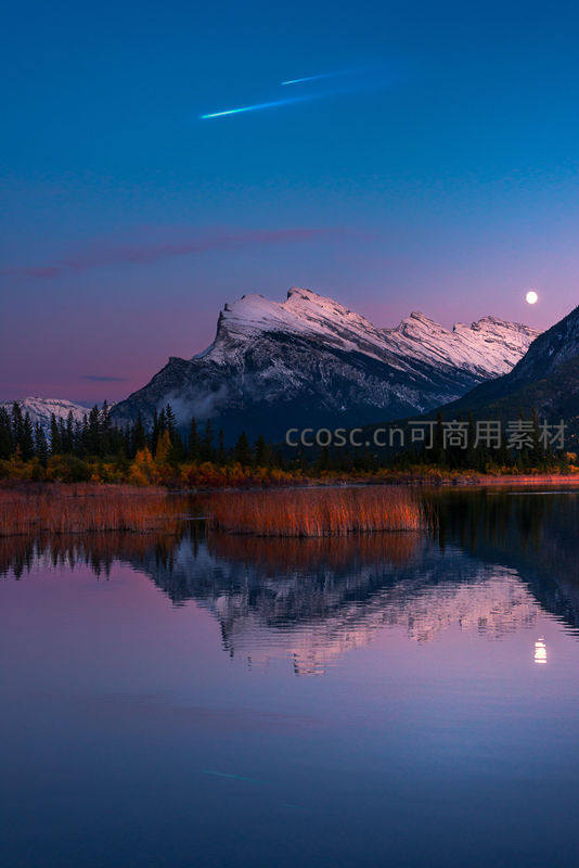 雪峰在湖中倒影如画,一轮明月高挂天边,一道流星划破长空,构成一幅宁静而梦幻的自然画卷。