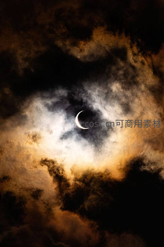 一弯纤细的新月悬浮于翻滚的云海中央,云层边缘被阳光染成金黄色,宛如神话中的仙境场景。