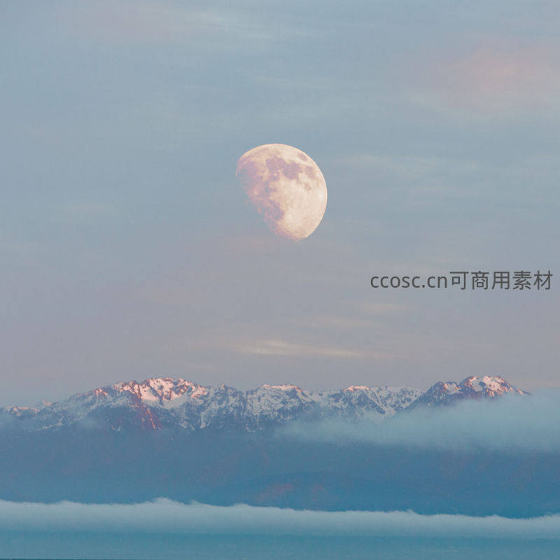 半轮明亮的月亮悬停在被晨曦染红的雪峰之上,下方是翻滚的云海,天地间一片宁静辽阔,展现出大自然无与伦比的壮丽与纯净。