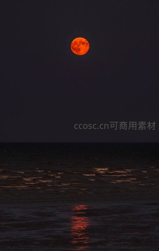 一轮巨大的血红色满月高悬于漆黑的夜空,其炽热的光芒在波光粼粼的海面上投下长长的倒影,景象壮观而神秘,令人屏息。