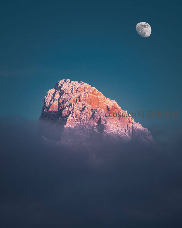 皎洁的月亮高悬于深蓝色夜空,映照着被霞光染红的巍峨山峰,云雾缭绕间尽显大自然的雄浑壮美。