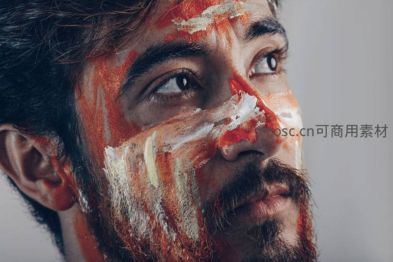 男子面部涂抹橙白相间的艺术彩绘,眼神向上凝视,充满表现力与戏剧感,展现现代艺术与人像结合的魅力。