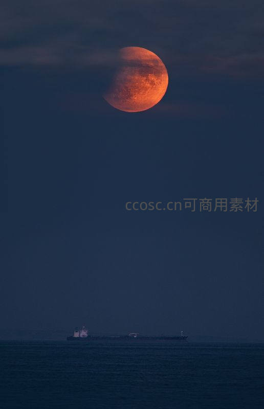 血月当空照,巨轮静泊海中央