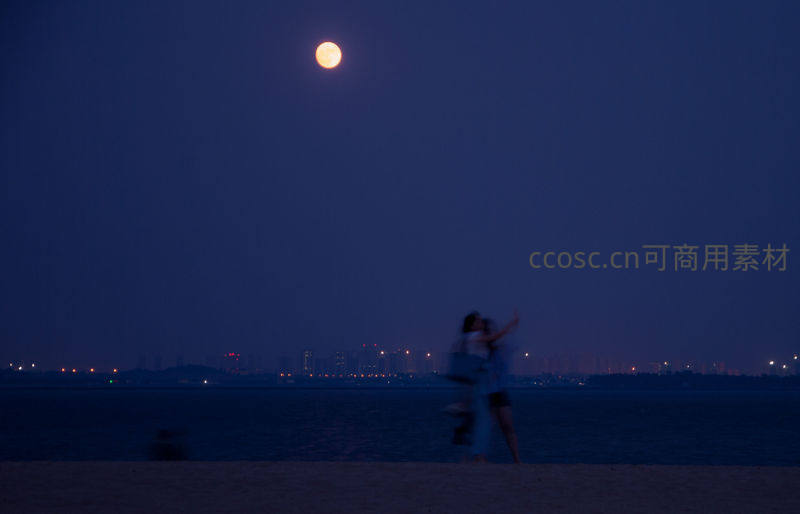 一对情侣在月光下的沙滩上相拥起舞,远处是灯火通明的城市天际线,构成一幅充满爱意与宁静的夜景画卷。