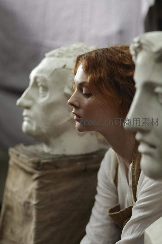 一位红发少女与两尊白色石膏头像并排而立,她闭目沉思,面容宁静,与冰冷的雕塑形成情感与材质的微妙对比,充满艺术张力。