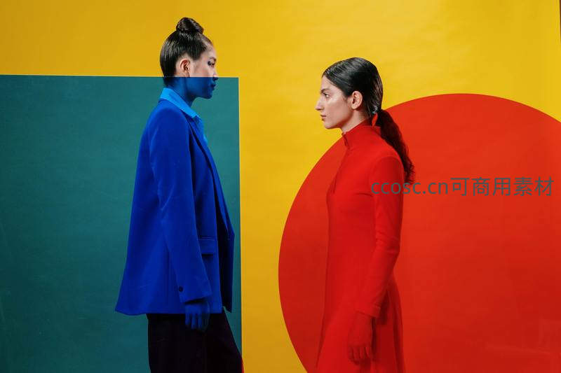 蓝红撞色背景下两位女性的时尚对视