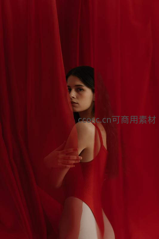 一位女子从鲜红帷幕后探身回眸,身着红色紧身连体衣,光线勾勒身形,营造神秘又性感的视觉张力与戏剧感。