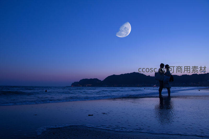 月下海滩情侣剪影浪漫时刻