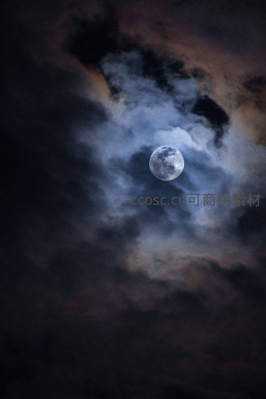 一轮满月从厚重云层的缝隙中透出清辉,营造出神秘而富有戏剧性的夜空景象。