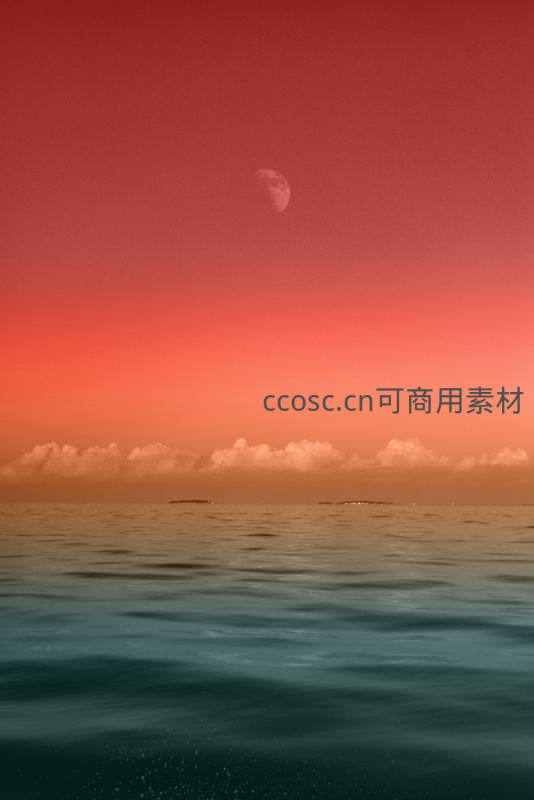 整片天空被染成浓烈的红色,一弯新月高悬,海面平静如镜,充满梦幻色彩。
