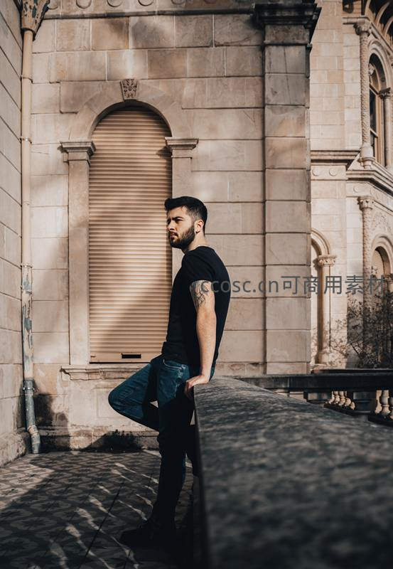 一名留着胡须的男子倚靠在古朴的石墙边,背景是带有拱形窗的欧式建筑,阳光与阴影交织,营造出静谧的城市氛围。