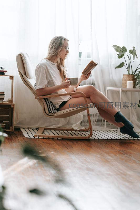 阳光透过白纱帘洒入房间,女子坐在舒适的摇椅上,手捧书本与咖啡杯,脚穿黑色袜子,享受宁静惬意的居家阅读时光。