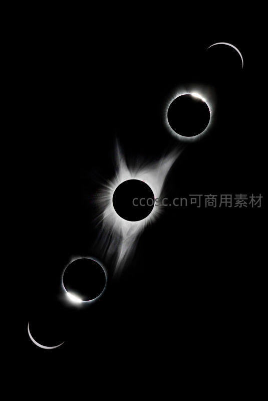 一组日食过程的合成影像,展示了太阳从初亏到食甚再到复圆的完整变化,中心日冕光芒四射,景象壮观而神秘。