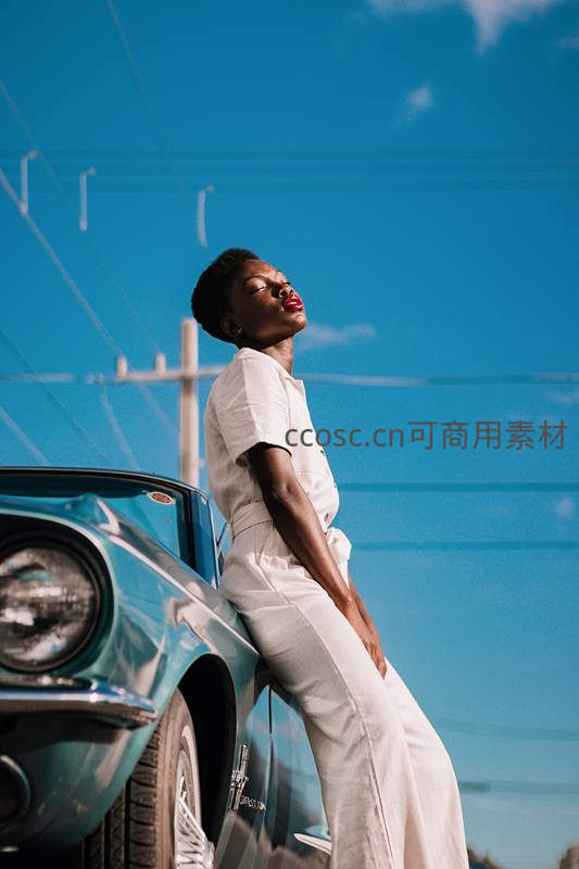 白衣女子倚靠复古跑车仰望蓝天