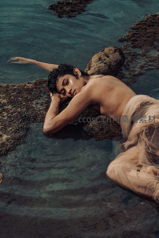 男子半卧于清澈水域中,头枕礁石,身披薄纱,眼神深邃,宛如自然中的艺术雕塑,充满诗意与张力。