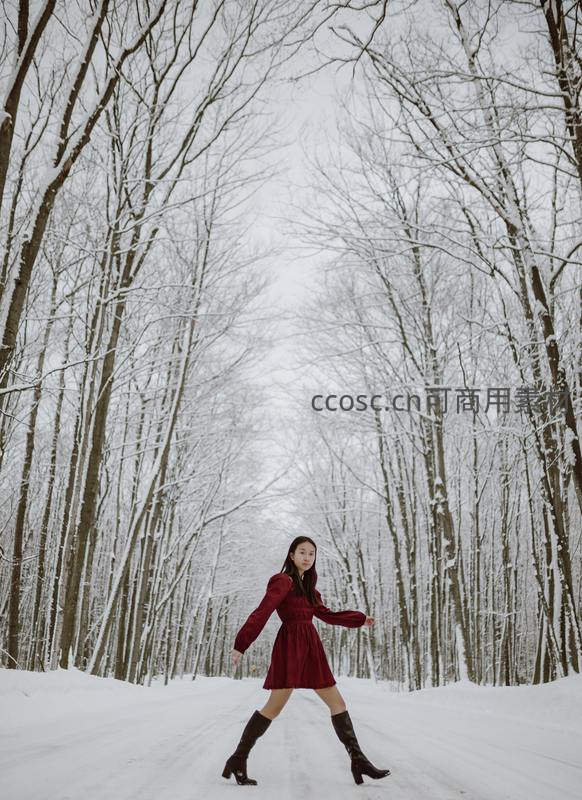 身穿酒红色连衣裙的女子在白雪覆盖的树林小径上行走,姿态优雅,与银装素裹的自然环境形成鲜明对比。