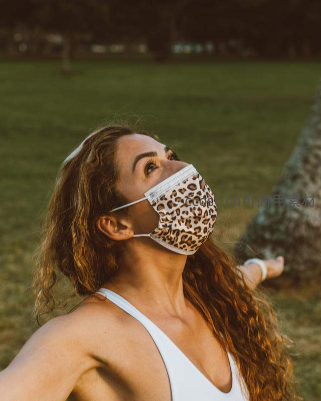 女子佩戴豹纹口罩,在阳光洒落的草地上仰头望向树梢,展现出健康活力与时尚个性并存的生活态度。