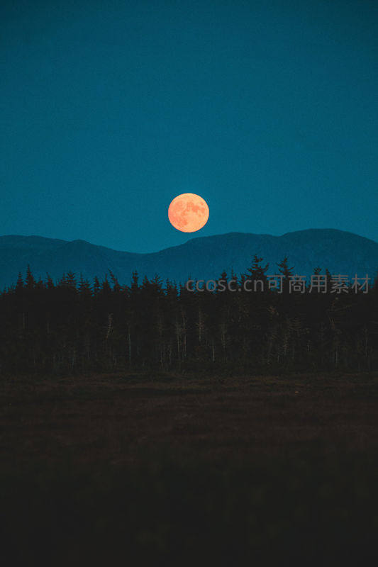 一轮巨大的橙红色满月从连绵的山峦后缓缓升起,前景是茂密森林的黑色剪影,整个画面充满原始而壮丽的自然气息。