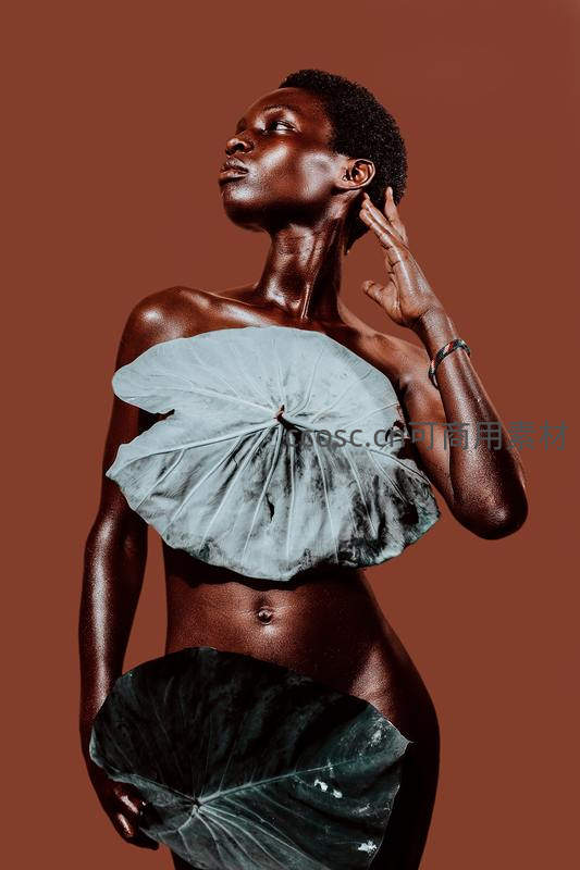 深肤色女性以荷叶作为创意服饰,在纯色背景前展现优雅姿态,光影突出身体线条与自然元素的融合美感。