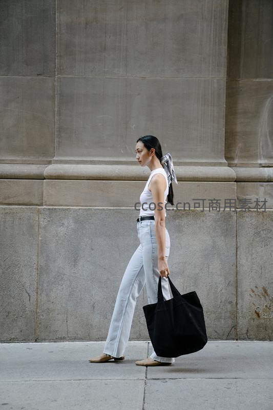 一位穿着简约时尚的女性行走在城市街道上,背景是厚重的石质建筑,整体画面呈现都市生活的从容与格调。