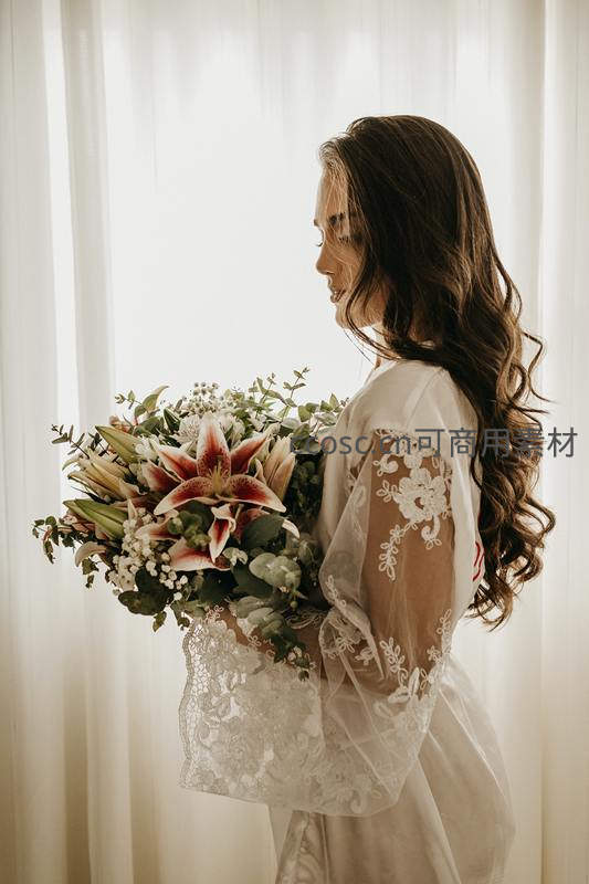 新娘侧影手持花束,蕾丝轻纱映窗光