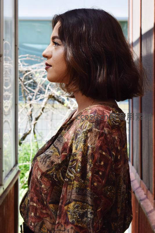 一位深色短发的女性侧身站在窗边,阳光洒在她的脸庞和带有复古花纹的上衣上,背景是模糊的庭院植物,营造出一种安静沉思的氛围。