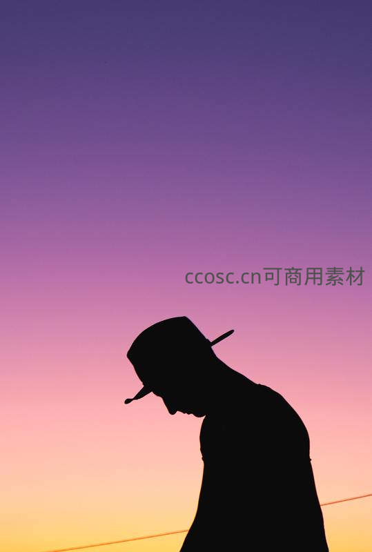 一个人物的黑色剪影在绚丽的紫粉渐变黄昏天空下低头伫立,戴着一顶帽子,姿态充满故事感,传达出一种宁静或略带忧郁的情绪。