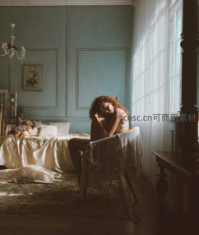 一位卷发女子在充满复古气息的卧室中,沐浴着从窗棂透入的温暖阳光,倚靠在椅子上陷入沉思,营造出宁静而诗意的氛围。