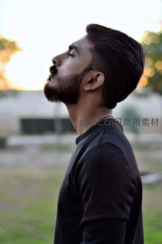 一位蓄着胡须的男子在黄昏的户外闭目仰头,深深呼吸,背景是柔和的落日余晖,营造出宁静与内省的氛围。