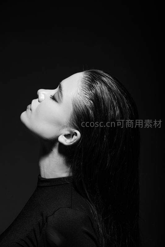 在纯黑背景下,女性侧脸被柔和光线勾勒出优雅轮廓,湿润长发与肌肤质感形成对比,传递宁静而深邃的情绪。