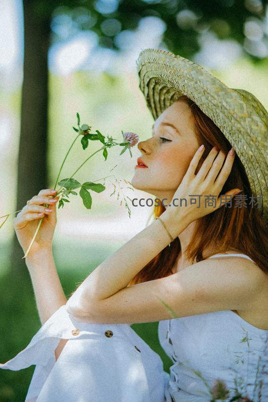 戴着草帽的少女在绿意盎然的户外轻嗅野花,阳光透过树叶洒落,画面充满夏日田园的清新与悠闲气息。