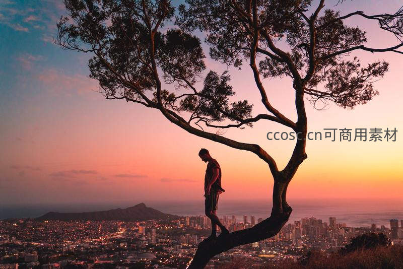 在绚烂的晚霞中,一人伫立于倾斜的树枝上,俯瞰灯火初上的城市全景,构成一幅充满诗意与哲思的黄昏剪影画面。