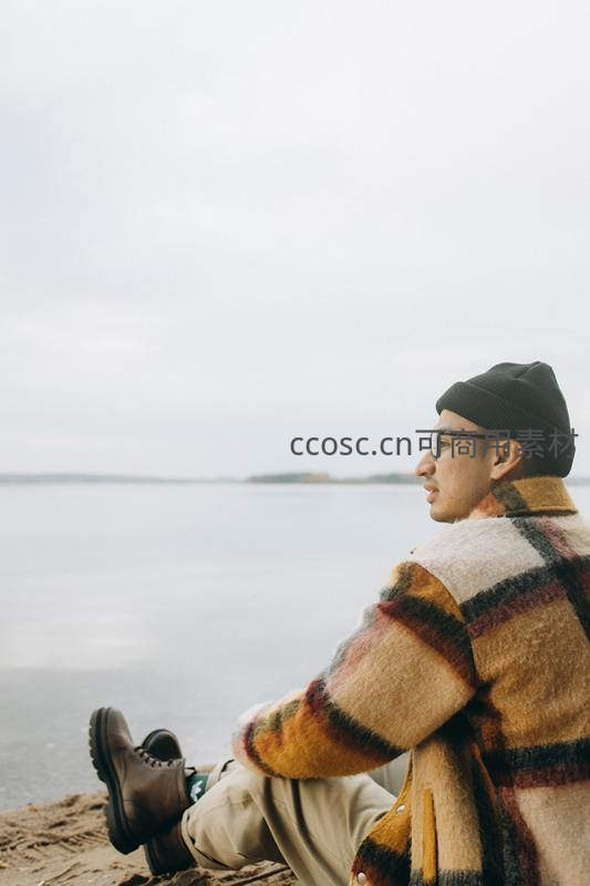 一名戴着眼镜和黑色针织帽的男子,裹着厚实的格纹毛呢大衣,安静地坐在沙滩上,侧脸望向远方平静的海面。