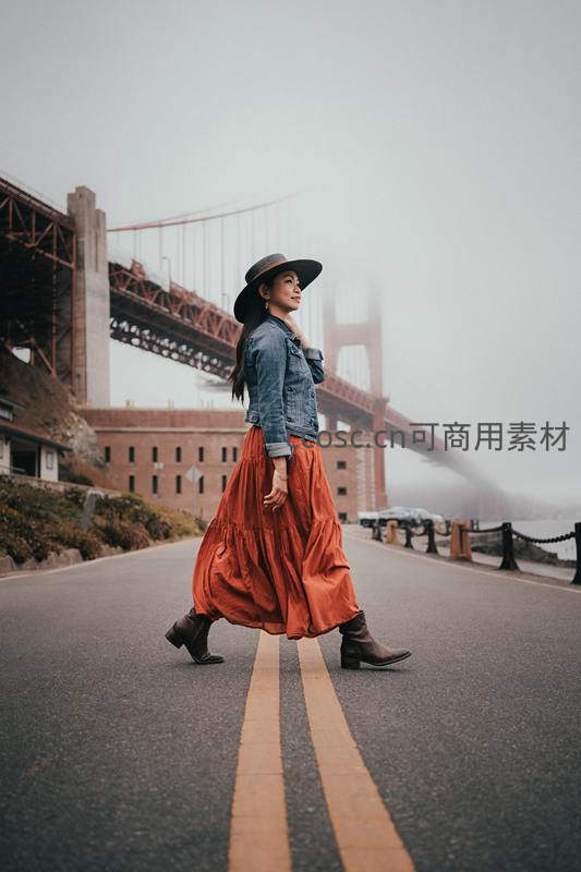 在浓雾笼罩的金门大桥旁,一位戴着帽子、穿着牛仔外套和橙色长裙的女子正沿着公路优雅行走,营造出电影般的浪漫氛围。
