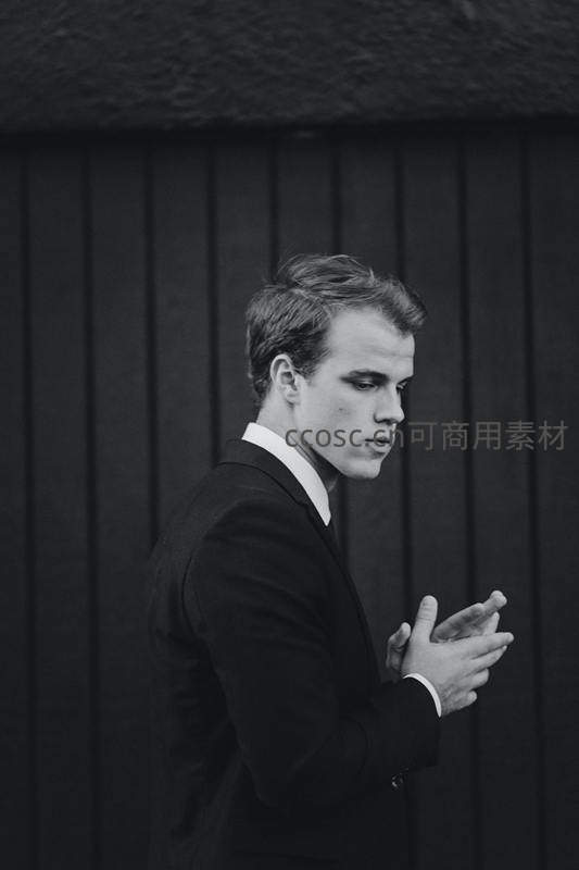 黑白色调下,男子身着西装侧立于木板墙前,双手交叠,神情专注而内敛,凸显经典时尚与沉稳气质。