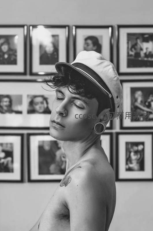 黑白照片中,一位佩戴船长帽、耳环和鼻环的青年闭目沉思,肩部纹身若隐若现,背景是陈列整齐的相框,充满艺术与个性气息。
