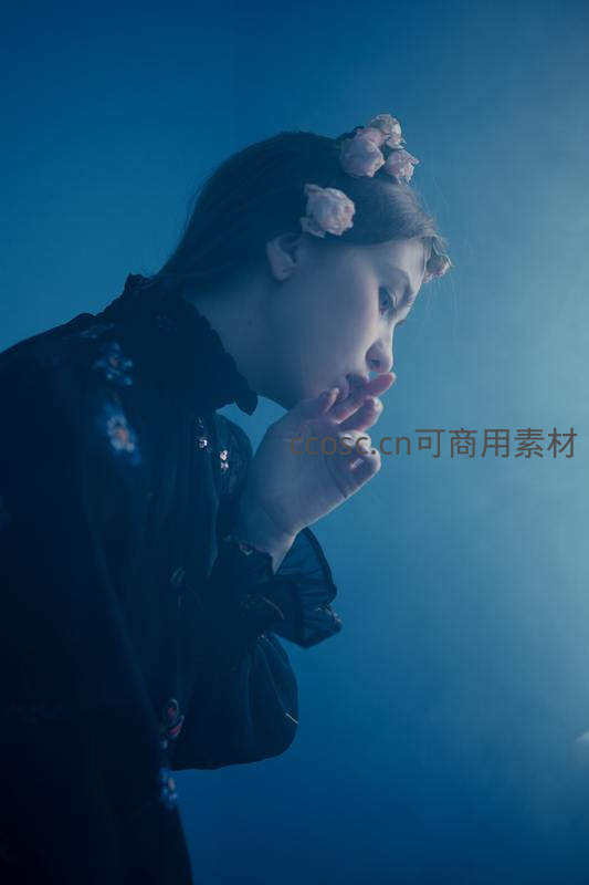 在浓郁的蓝色背景下,一位少女低头沉思,发间点缀着柔美的花朵,手轻触唇边,营造出梦幻而宁静的艺术氛围。