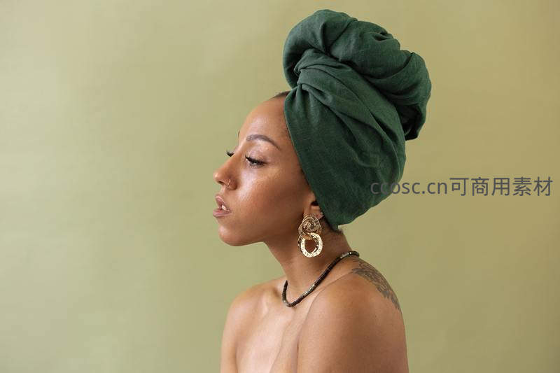 女子佩戴深绿色布艺头巾,搭配金色大耳环和颈链,肩部可见纹身,侧脸轮廓清晰,气质沉静而富有艺术感。