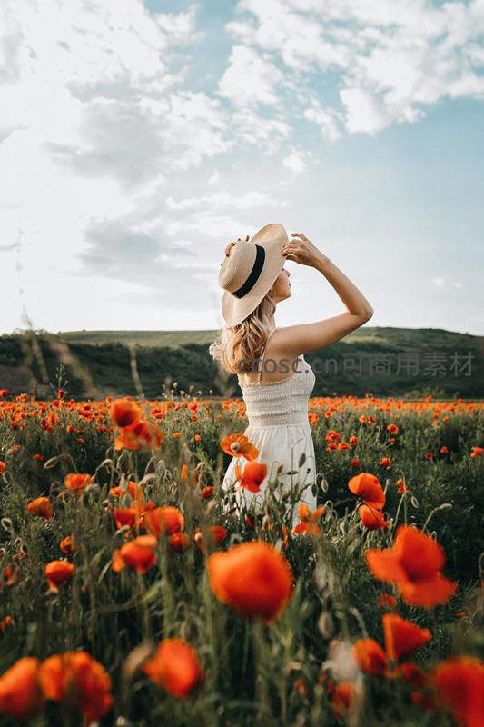 金发女子身着白裙立于橙红罂粟花田,手扶草帽仰望蓝天白云,画面充满自由、浪漫与自然的诗意气息。