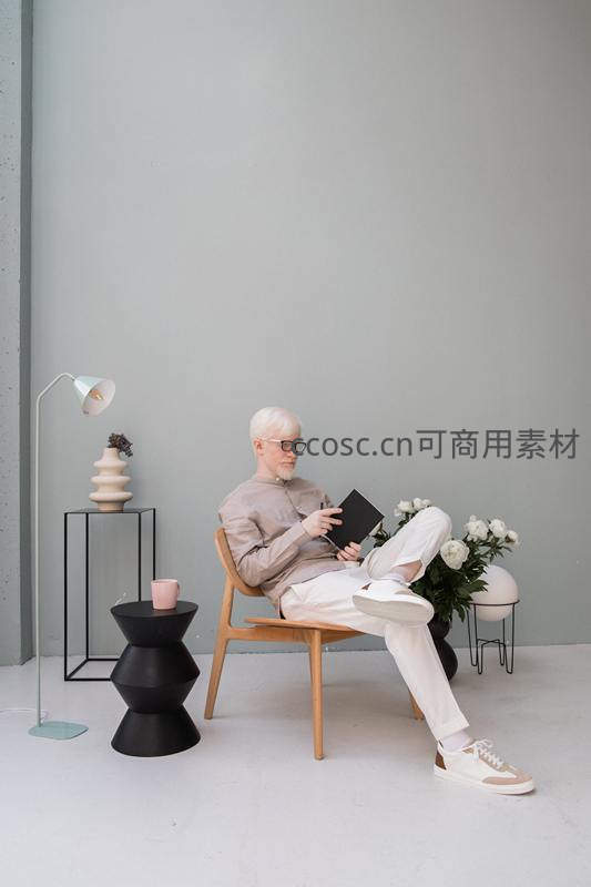 白发长者坐于木质单椅,专注阅读黑色书籍,周围现代简约家具环绕,展现宁静高雅的居家生活美学。