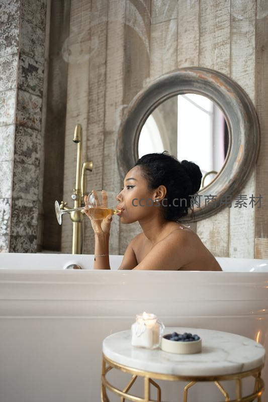 黑发女子在复古浴缸中啜饮美酒,身旁点缀蜡烛与蓝莓,圆形镜面映照空间,尽显精致惬意的自我疗愈时光。