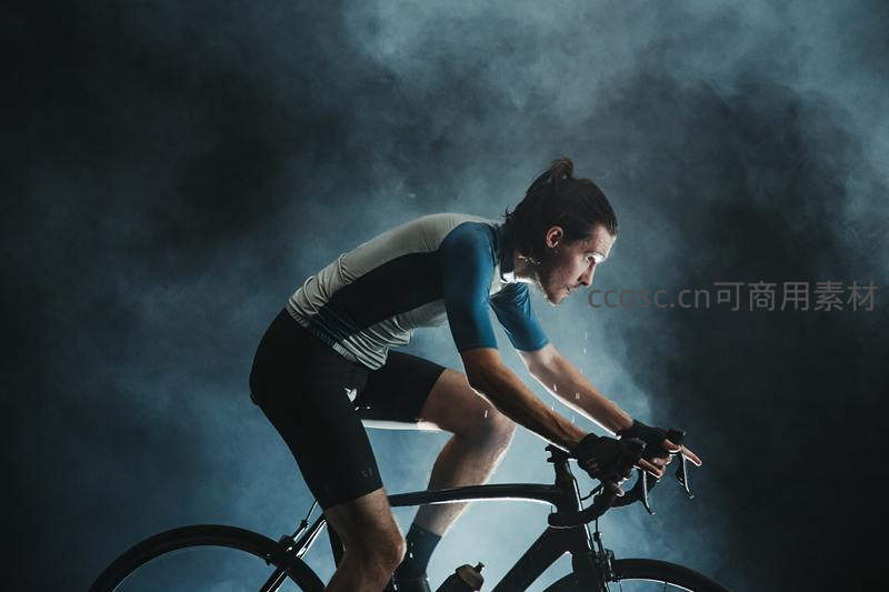 男性骑行者在烟雾缭绕的暗色背景下全力蹬车,汗水飞溅,眼神专注,展现出极限运动中的力量与意志力,充满视觉冲击力。
