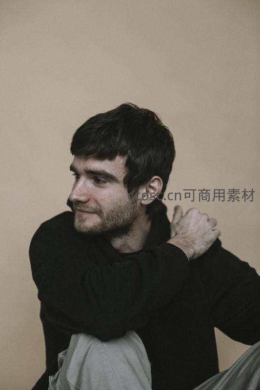 一名青年男性身着黑色卫衣,坐在纯色背景前,双臂环抱,目光低垂,神情略带思索,整体画面简洁干净,充满文艺气息。