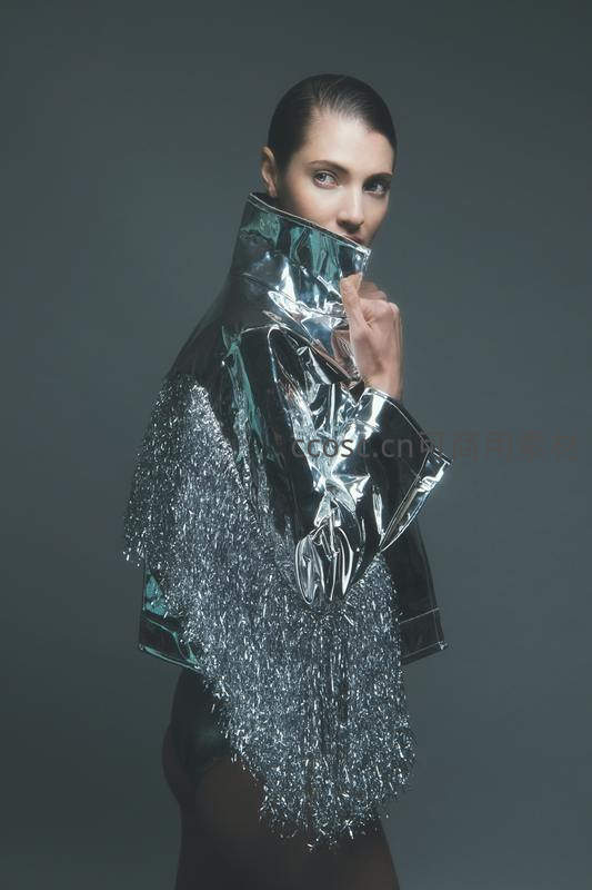 模特身着一件具有强烈未来科技感的银色反光高领外套,搭配流苏装饰,姿态冷峻,在灰调背景下展现前卫时尚与视觉冲击力。