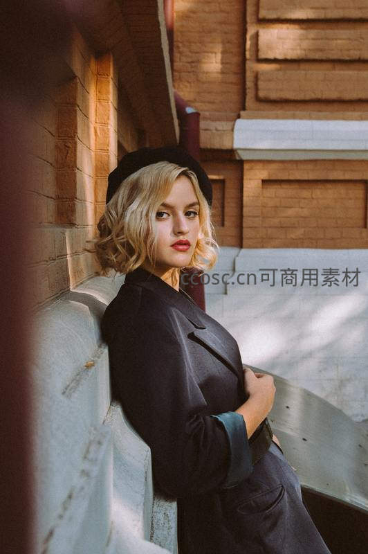 金发女子头戴黑色贝雷帽,身着深色西装外套,倚靠在阳光斑驳的红砖墙边,回眸一瞥,尽显复古都市时尚感。