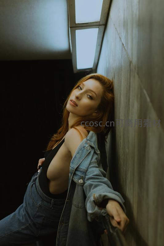 一位红发女子倚靠在粗糙的水泥墙边,身穿牛仔外套与背心,眼神迷离望向镜头,在明暗对比的灯光下展现出独特的时尚感与个性魅力。