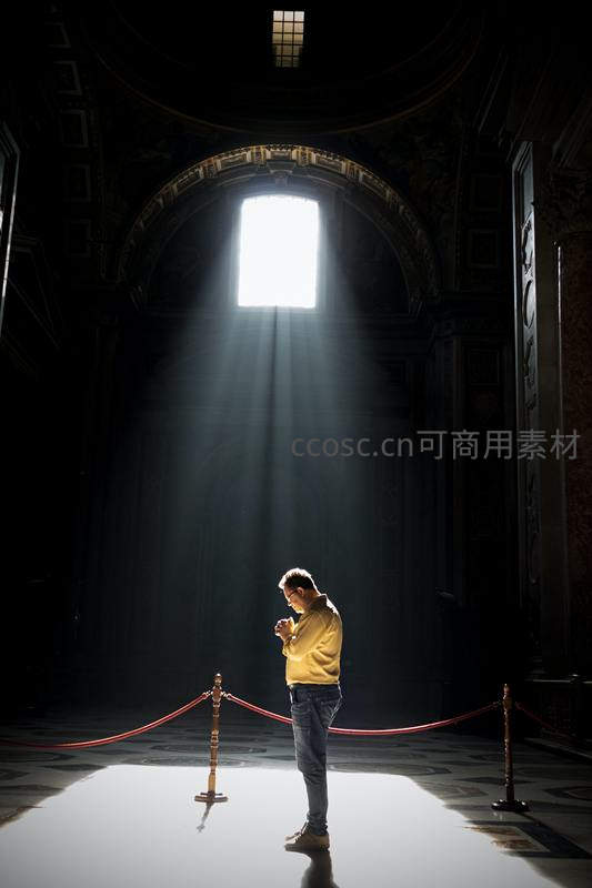 在宏伟的教堂内部,一束圣洁的光线从高窗倾泻而下,照亮了一位低头祈祷的信徒,周围环境幽暗,凸显出信仰的庄严与内心的宁静。
