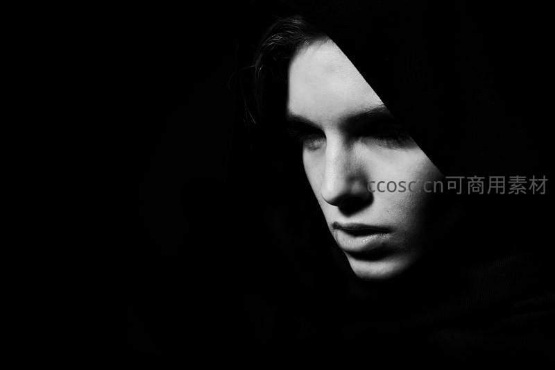 在纯黑背景下,一张年轻男性的侧脸被戏剧性光线勾勒,眼神深邃,充满故事感与神秘气质,展现极简主义的视觉冲击力。