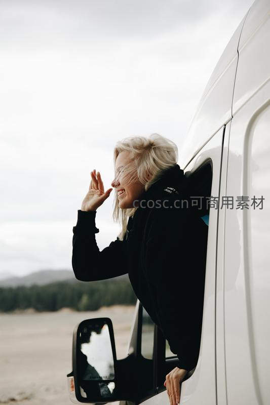 一位金发女子从白色厢式货车车窗探出身子,面带灿烂笑容向远方挥手,背景是开阔的荒野与远山,传递自由与喜悦的旅途心情。